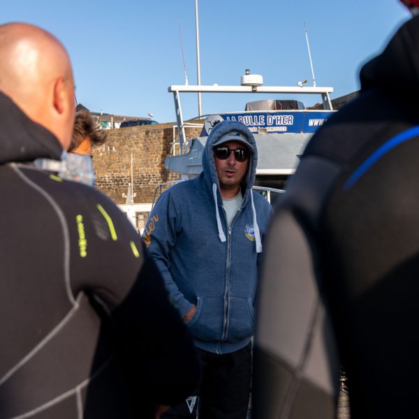 Chez La Bulle d’Her, la formation alterne préparation à terre et plongées en mer. Vous apprenez à utiliser votre matériel, à gérer votre immersion et votre stabilisation, à respirer calmement sur détendeur, ainsi qu’à réaliser les gestes de base comme le palmage, le vidage de masque et la remontée en sécurité.